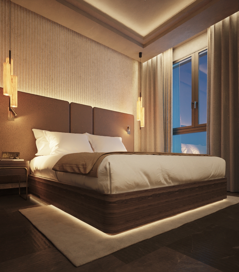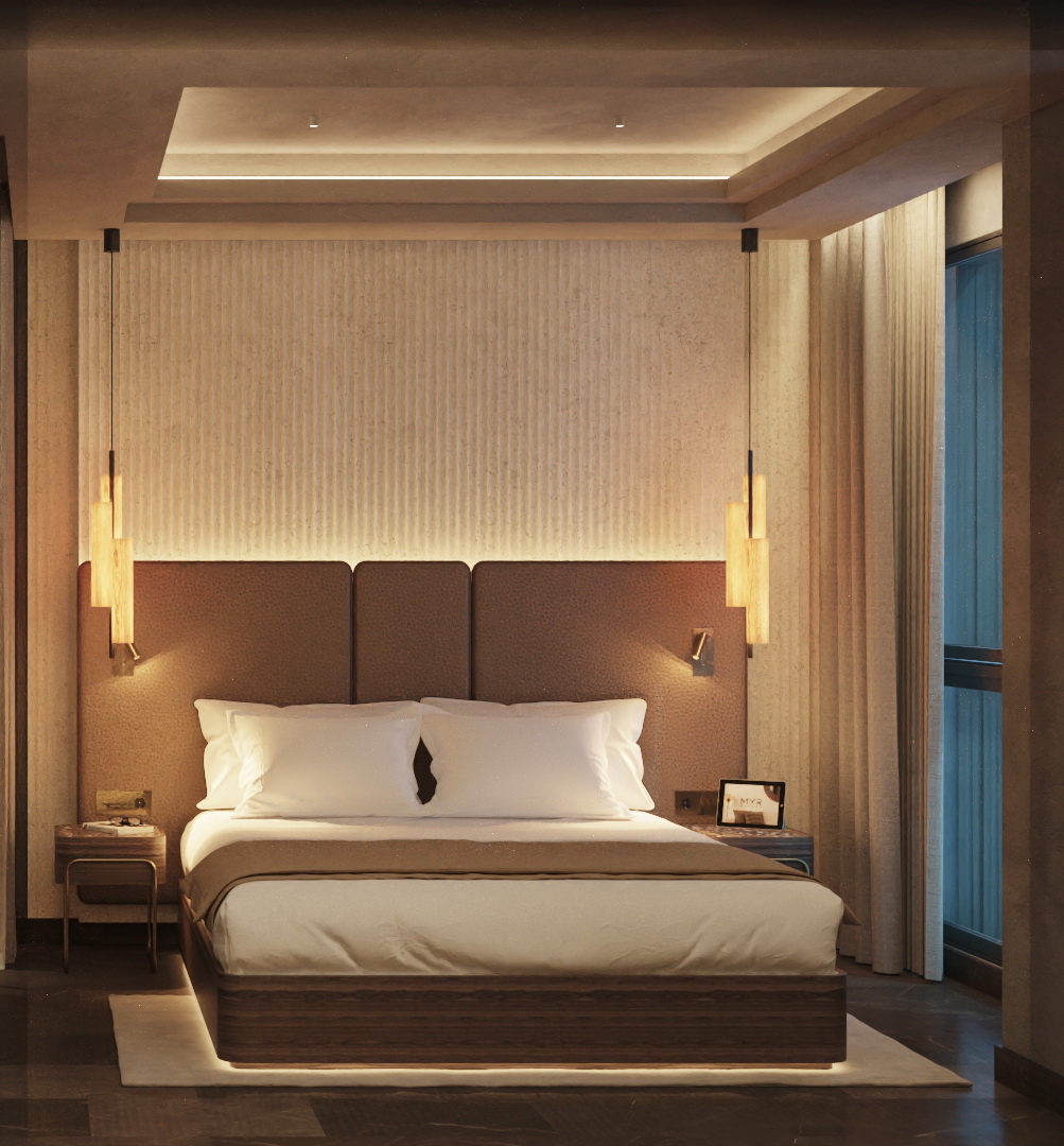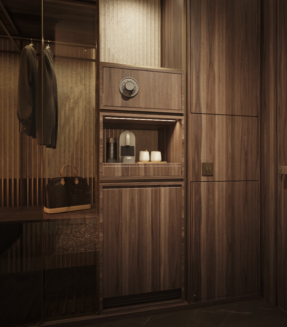 El espacio combina formas depuradas, materiales nobles y texturas sensoriales, creando un ambiente sobrio pero acogedor. Cada detalle ha sido pensado para su comodidad: caja fuerte, minibar, cafetera y hervidor con set de cortesía de tés y cafés, climatización personalizable, además de un escritorio y un rincón de lectura que equilibran trabajo y relajación.
